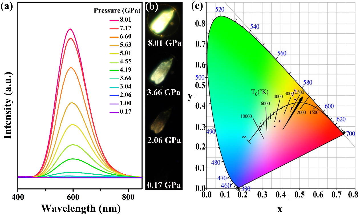 压力,作为一种独立的热力学参量和是一种环保而高效的手段,在改善材料物理化学性质方面具有良好的应用前景。但是,对于大多数钙钛矿材料,其荧光性质在压力下都会不断衰减并且会完全猝灭。激子自陷态非常依赖于钙钛矿体系的维度,对于一维钙钛矿体系很容易产生自陷态激子。通过调控卤素钙钛矿的八面体扭曲程度,可以有效的改善自陷态激子的复合发光,为提升一维钙钛矿材料的光学活性提供了有效途径。