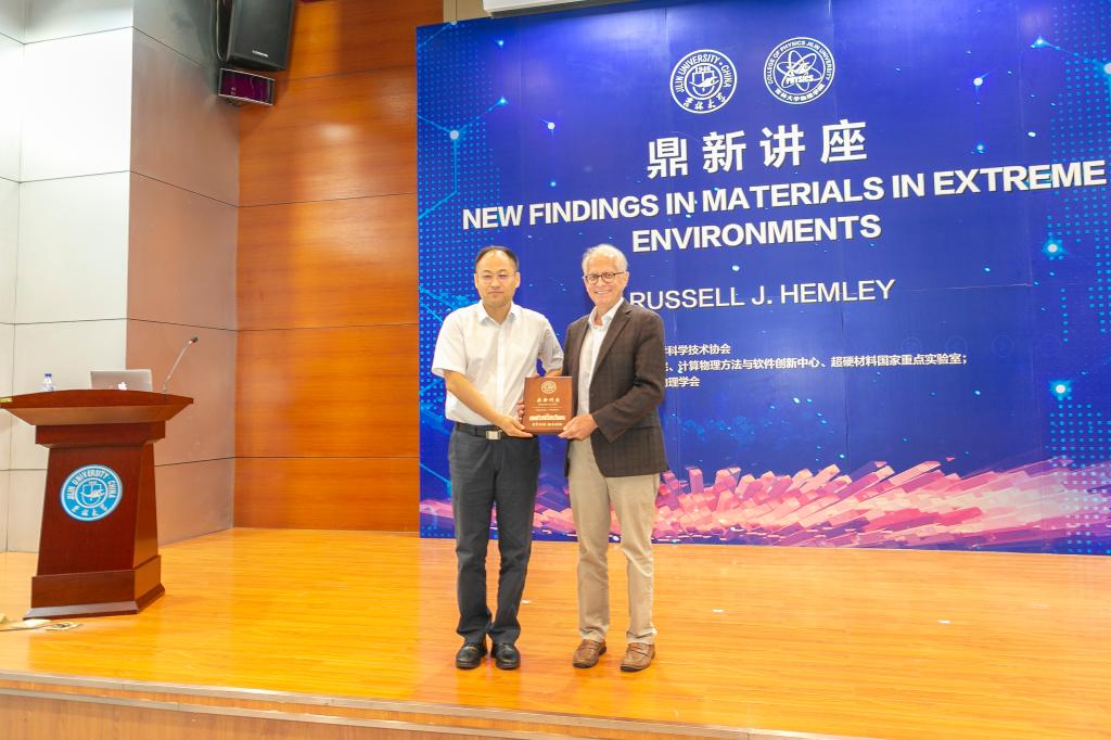 2019年8月24日,国际高压领域著名专家、美国国家科学院院士Russell J. Hemley应邀做客PA捕鱼网官网入口鼎新讲座,在国际学术大讲堂为全校师生作题了为“New Findings in Materials in Extreme Environments”的学术报告。PA捕鱼网官网入口院长马琰铭教授主持讲座,并为Hemley教授颁发了鼎新讲座纪念牌。