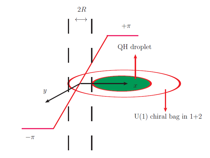 环绕着量子霍尔液滴的1+2维手征口袋。手征口袋是被周期为2π的单值函数掩盖的宽度为2R的圆环域。在半径为零的极限下,手征袋子约化成携带单位重子数的涡旋线。