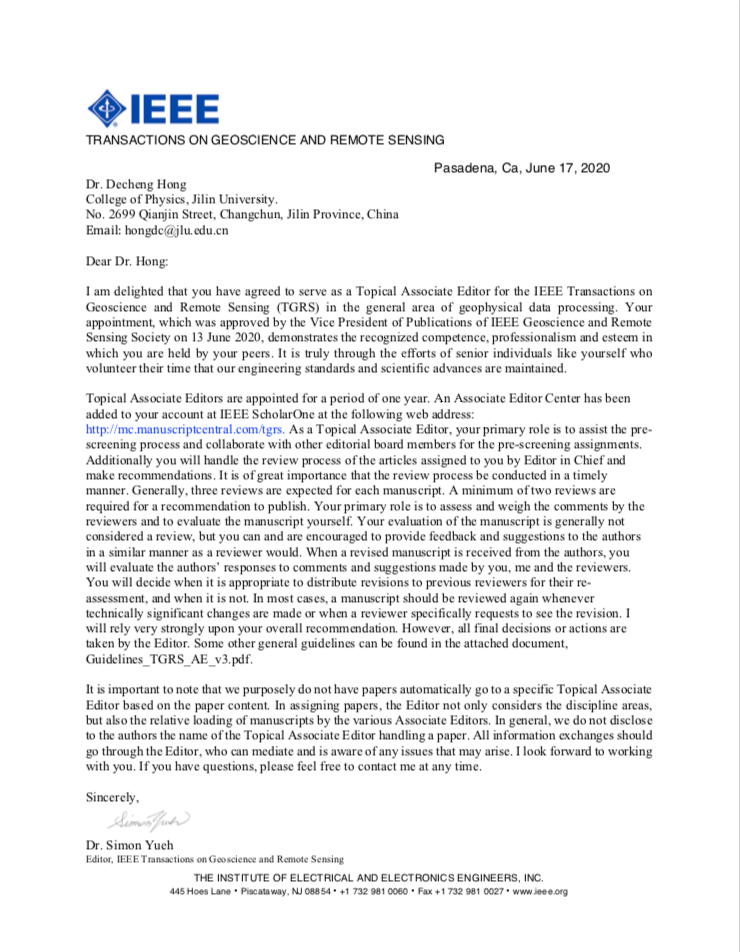 近日,PA捕鱼洪德成教授被美国电气和电子工程师协会 (Institute of Electrical and Electronics Engineers,IEEE) 正式任命为旗下学术期刊IEEE Transactions on Geoscience and Remote Sensing(TGRS)副主编。