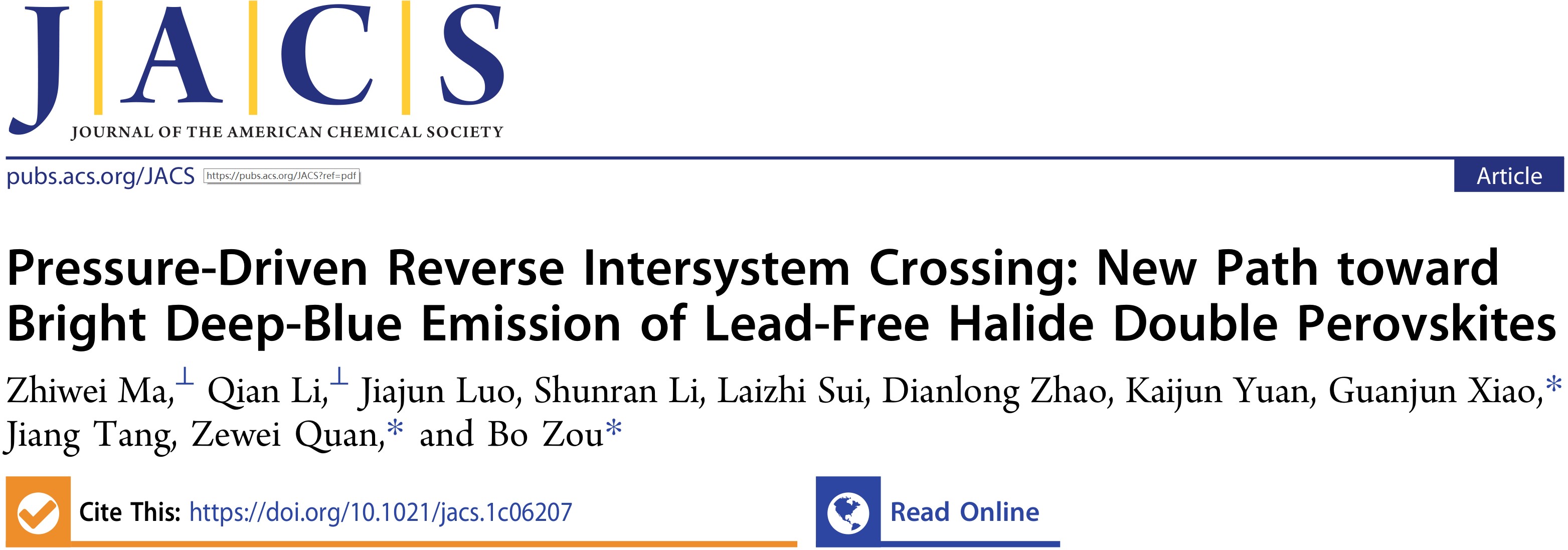 相关工作以“Pressure-Driven Reverse Intersystem Crossing: New Path towards Bright Deep-Blue Emission of Lead-Free Halide Double Perovskites”为题,发表在Journal of the American Chemical Society (DOI: 10.1021/jacs.1c06207)上。PA捕鱼网官网入口超硬材料国家重点实验室马志伟博士和南方科技大学李茜博士为该论文共同第一作者,PA捕鱼网官网入口肖冠军教授、邹勃教授和南方科技大学权泽卫教授为该论文通讯作者。本工作得到了国家自然科学基金和科技部重点研发计划项目等基金的资助。