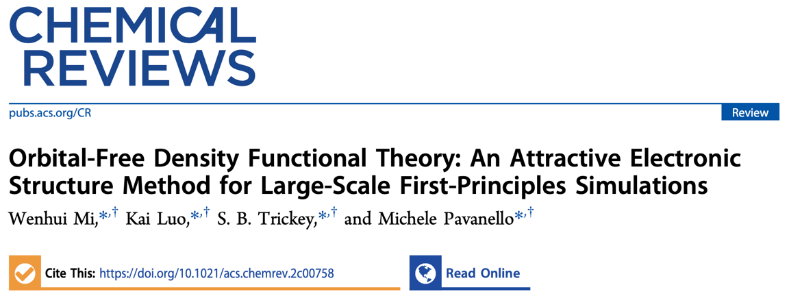 日前,PA捕鱼网官网入口米文慧教授及合作者对无轨道密度泛函理论进行系统综述,相关研究成果以“Orbital-Free Density Functional Theory: An attractive electronic structure method for large-scale first-principles simulations”为题,于2023年10月23日在线发表于《Chemical Reviews》。Chemical Reviews (2023年影响因子:62.1)是由美国化学学会于1924年创刊并发行至今的国际化学领域内最具权威性的学术期刊之一,致力于发表最具影响力的综述文章,以综合性、权威性以及可读性强而著称。