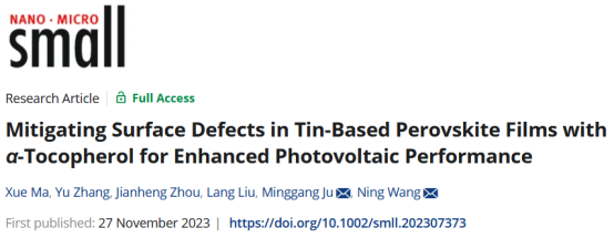 近日,PA捕鱼网官网入口凝聚态物理系王宁教授团队在锡基钙钛矿太阳电池(PSCs)研究方面取得重要进展,相关成果以“Mitigating Surface Defects in Tin-Based Perovskite Films with α-Tocopherol for Enhanced Solar Cell Performance”为题发表在国际知名学术期刊《Small》(DOI:10.1002/smll.202307373)。