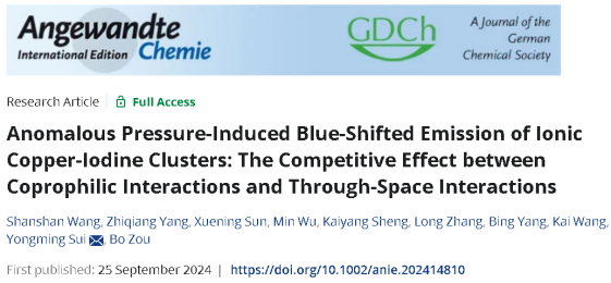 近日,PA捕鱼网官网入口超硬材料国家重点实验室邹勃教授团队隋永明课题组利用压强调制亲铜和空间相互作用,实现了离子型铜碘簇奇异的压致蓝移发光行为。相关研究成果以“Anomalous Pressure-Induced Blue-Shifted Emission of Ionic Copper-Iodine Clusters: The Competitive Effect between Coprophilic Interactions and Through-Space Interactions”为题发表于《Angewandte Chemie International Edition》。