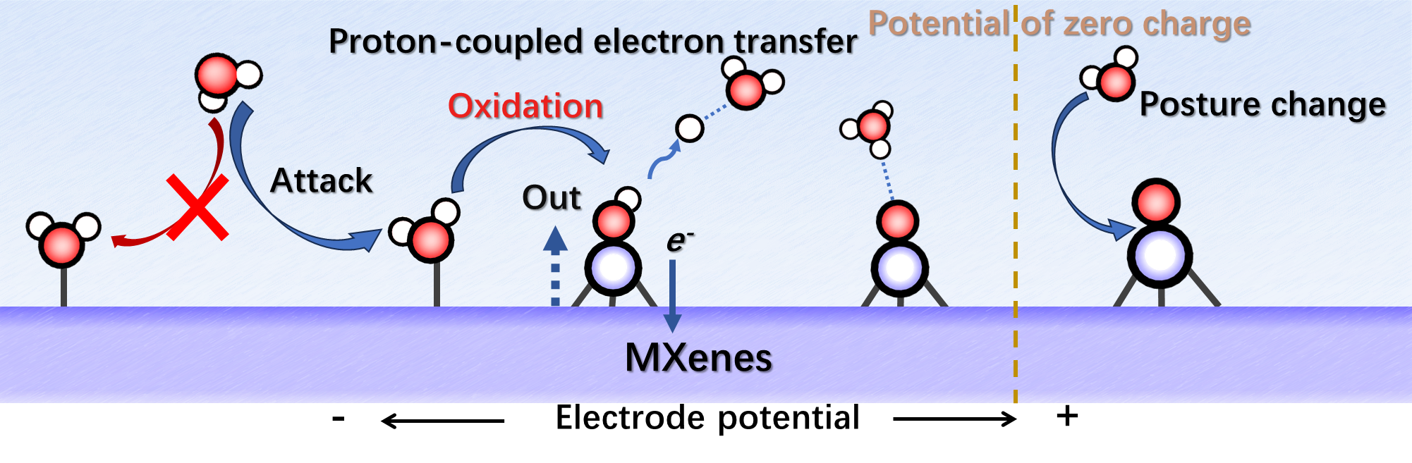 MXenes是一类新兴的二维材料家族,化学式为Mn+1XnTm,M表示过渡金属,X代表碳或氮,T为外层表面官能团。该材料家族包含百万个潜在成员,有着丰富的电子、化学和机械性能,在水系电池和电催化等领域展现出广阔的应用前景。研究人员普遍关心MXenes是否会因与周围环境相互作用而发生氧化降解,引发性能下降甚至损坏。现有研究表明,在电化学反应过程中,环境水分子与电极电势显著影响着MXenes材料的氧化行为。然而,MXenes材料的氧化机制及其对电极电势的依赖性仍未得到充分理解,严重阻碍了它的实际应用与推广。因此,亟需发展一种简单有效的理论模型评估其在工况条件下的稳定性,为优质MXenes电极材料的设计与选取提供科学指导。