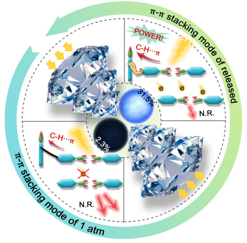 具有缺电子基团和芳香环的有机分子由于p-π*共轭效应可以促进分子内电荷转移,为开发高效发光材料提供广阔的应用平台。然而,在形成聚集体时,吸电子能力使芳香环的π电子密度降低,从而降低了芳香环间的静电斥力。这将导致π-π相互作用增强,降低荧光量子产率。高压作为独立于温度和化学组分的热力学参量,可以有效地缩短原子间距离、改变材料的晶体结构,进而使材料产生优异的光学性质。基于此,杨新一课题组提出利用压强处理策略调控分子堆积方式,实现初始弱荧光有机材料的高效蓝光发射。