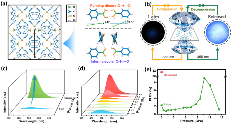 近日,PA捕鱼网官网入口高压与超硬材料全国重点实验室邹勃教授团队杨新一课题组通过压强处理工程调控分子堆叠模式实现了苯硼酸(PBA)的高效蓝光发射,其荧光量子产率由初始的2.3%提高到了31.5%。相关研究成果以“Pressure-Tailored π-π Stacking in Dimers Enhances Blue Photoluminescence in Boron-Based Organic Molecules”为题发表在国际学术期刊《Laser & Photonics Reviews》上。