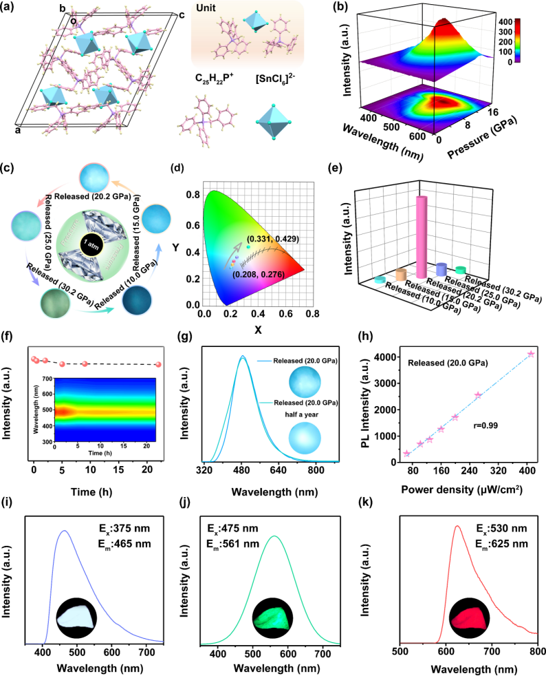 在该工作中,肖冠军教授等人选择无辐射零维锡基有机-无机杂化卤化物(C25H22P)2SnCl6作为研究对象,借助高压工程,成功点亮了(C25H22P)2SnCl6,实现了明亮的荧光发射。经过20.0 GPa高压处理卸压后,(C25H22P)2SnCl6明亮的蓝白光发射可以稳定保存在常压条件,甚至在空气中稳定维持半年之久。这种不可逆的荧光开启行为主要归因于复杂有机分子苄基三苯基氯化磷的引入构筑空间位阻效应和氢键增强,提高高压相变势垒,实现不可逆非晶化相变。通过同步辐射X射线衍射与径向分布函数分析,非晶相发光材料(C25H22P)2SnCl6中,Sn-Cl无机八面体键长、键角畸变增加了近2个数量级,显著的无机结构畸变有效增强了电子-声子耦合,诱导激子自陷并产生自陷态激子发射。Hirshfeld表面计算表明,卸压后,氢键C-HꞏꞏꞏCl键长缩短,氢键数量增加,显著增强了无机八面体[SnCl6]2-与有机阳离子苄基三苯基氯化磷的氢键相互作用,抑制热振动诱导的能量耗散,降低非辐射弛豫过程,最终实现高品质发光高压相的常压截获。与此同时,密度泛函理论表明,非晶相发光材料(C25H22P)2SnCl6的跃迁偶极矩提高了一个数量级。结合高压处理前后发光寿命与量子产率的对比分析可知,卸压后非晶相发光材料(C25H22P)2SnCl6的非辐射跃由起始的近100%显著降低至49.8%,从而产生的明亮发射。值得注意的是,经高压处理后的非晶相发光材料(C25H22P)2SnCl6表现出明显的激发依赖性发射,在355、375、475以及530 nm的激发光下,分别呈现出蓝白光、白光、绿光以及红光。激发谱测试表明该激发依赖性主要源于高压处理后产生的具有不同激发能级的多重自陷态激子发射。