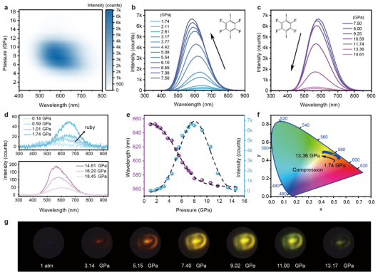 近日,PA捕鱼网官网入口高压与超硬材料全国重点实验室刘冰冰、姚明光教授等人通过高压调控二碘四氟苯(1,4-DITFB)分子晶体中碘原子与近邻分子的“轨道共享”,首次在该体系中实现了压强诱导从无到有、蓝移增强和寿命延长的室温磷光(RTP)发射。相关成果以“Room-temperature phosphorescence and anomalous piezochromism in molecular crystals enabled by iodine atomic orbital sharing”为题发表在国际权威学术期刊《Nature Communications》上。