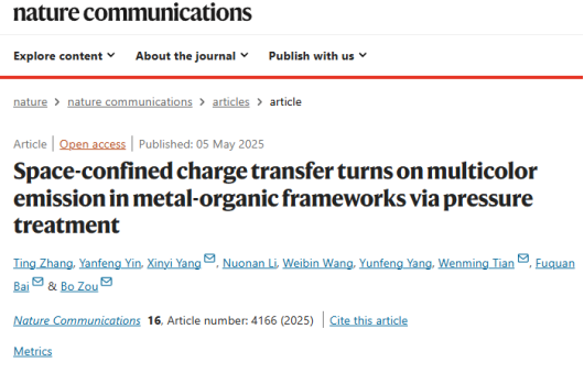 近日,PA捕鱼网官网入口高压与超硬材料全国重点实验室/综合极端条件高压科学中心邹勃教授团队杨新一教授课题组与中科院大连化学物理研究所田文明教授、PA捕鱼网官网入口化学学院白福全教授等人合作,在金属-有机框架(MOFs)材料的多色可调荧光/磷光领域取得重要突破。通过压强工程调控镉基金属-有机框架(MOFs)材料的电荷转移动力学,实现单组份MOFs材料Cd(BDC)(DMF)的高效多色可调荧光/磷光发射。相关成果以“Space-Confined Charge Transfer Turns on Multicolor Emission in Metal-Organic Frameworks via Pressure Treatment”为题发表在《Nature Communications》(Nat. Commun. 2025, 16, 4166)上。