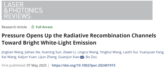 近日,PA捕鱼网官网入口高压与超硬材料全国重点实验室邹勃教授团队肖冠军教授等人在全无机非铅金属卤化物的压强诱导发光研究中取得重要进展,通过高压打开了辐射跃迁通道,实现了一维金属卤化物Cs2AgI3“无光”到“有光”的反常压强诱导PIE行为(Pressure-Induced Emission, PIE),产生了高压下的高品质明亮白光发射,并深入揭示了背后的物理机制,推动了压力传感、压力开关和高压极端条件下的特种照明与显示应用。相关研究成果以“Pressure Opens Up the Radiative Recombination Channels Toward Bright White-Light Emission”为题发表在《Laser & Photonics Reviews》上。
