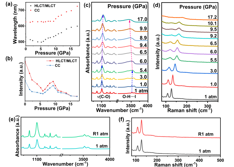 本工作利用原位高压技术,通过外部压强精确调控晶体内部的铜-铜耦合相互作用以及空间电荷转移,实现了材料发光性能的调控。研究表明,金属-配体电荷转移态(MLCT/HLCT)在初始加压阶段(<5.9 GPa)发生蓝移,其强度逐渐增强;在5.9至9.3 GPa的压强区间内,材料表现出显著的发射峰红移,并伴随压力诱导发光增强;而在高压区间(>9.3 GPa)则因Cu–Cu键长缩短与电子云重叠增强,激发态间能垒下降,电子逐步从高能态(MLCT/HLCT)弛豫至低能簇中心发射态(CC),从而实现了发光谱的红移与强度增强的调控。高压拉曼与红外测试进一步揭示了Cu–I簇与有机阳离子之间氢键网络的演变机制,证实了高压对分子振动模及其耦合行为的显著调控作用,O-H···I与C–O键在高压下的振动强度变化是导致电子结构变化和能级重排的主要原因。