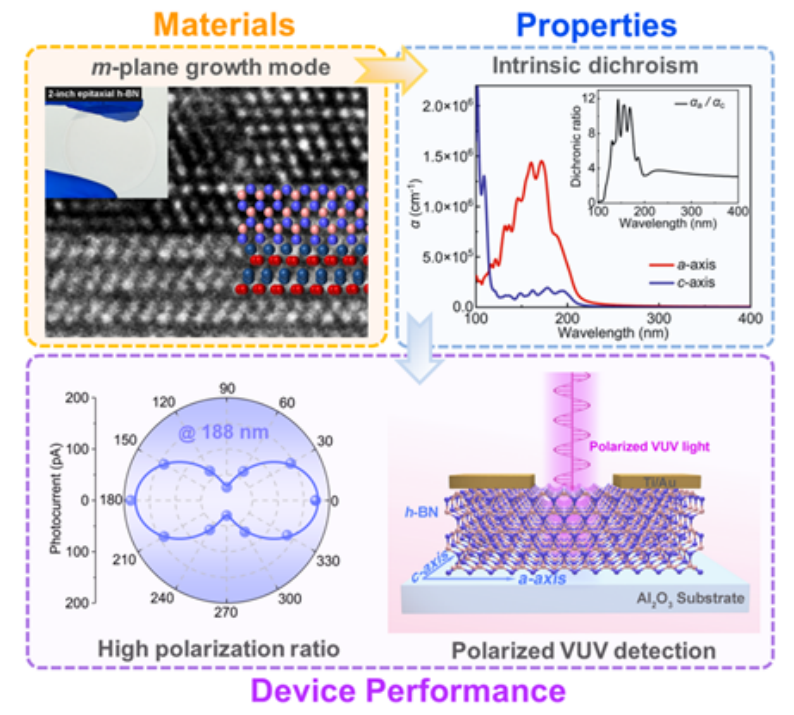 图:m面异质外延h-BN原子排列、二向色性及VUV偏振光探测性能