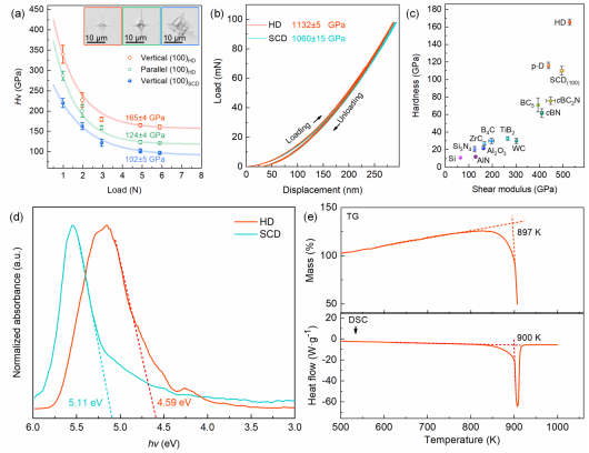 研究系统表征了六方金刚石的力学与功能特性(图4)。揭示了合成六方金刚石具有显著的力学各向异性:垂直(100)面方向维氏硬度达165±4 GPa,平行方向为124±4 GPa。垂直方向硬度值较立方金刚石(100)面提升61.8%。纳米压痕测试显示六方金刚石杨氏模量(100)面达1132±5 GPa,立方金刚石(100)面(1060±15 GPa)提升6.8%。六方金刚石具有4.59 eV的带隙,较单晶立方金刚石(5.11 eV)收窄10.2%。热重-差热(TG-DSC)分析表明六方金刚石在空气中可稳定至900 K。