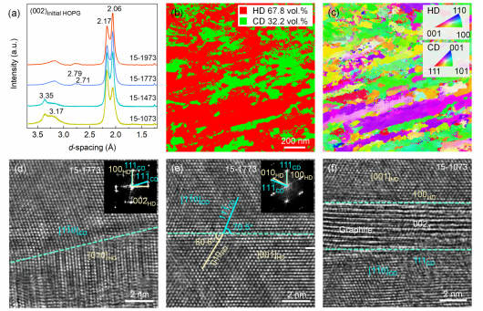 研究团队还与中山大学候仰龙教授、朱升財教授团队合作阐明了六方金刚石在高温高压环境下的形成机制,指明了石墨基面AB层堆叠和抑制层间的过度滑移是合成六方金刚石的关键。发现当石墨ABAB堆垛保持良好,沿石墨[001]方向的准单轴压缩抑制横向滑移,温度条件温和时,石墨会转变为HD;而当ABAB堆垛受到干扰或层滑移距离较大时,石墨会转变为CD。