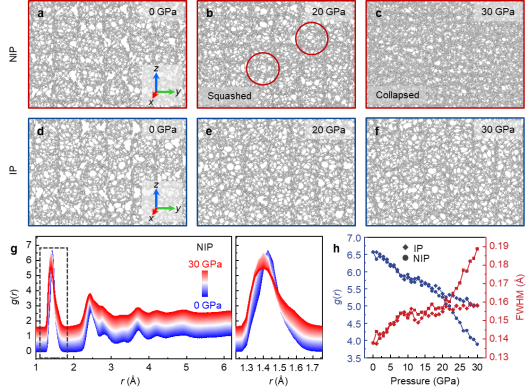 为了深入探究单轴应力对次晶态金刚石合成的影响,研究团队借助大尺度分子动力学对比了C60分子在单轴压力(NIP)和静水压(IP)条件下的结构转变,证明了单轴应力的引入显著破坏了C60分子的球对称结构,致使其在较低的压力下坍塌。这一过程加速了C60在高压下非晶化(图8),有助于其在低的压力条件下转变为次晶态金刚石。这项研究揭示了单轴性应力在低压次晶态金刚石过程中的关键作用,为开发新型低成本高压材料提供了一种有效的策略。