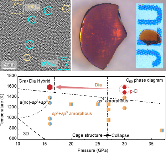 7. 突破高温高压下C60的传统实验相图,在16 GPa-1600 K条件下获得透明次晶态金刚石。