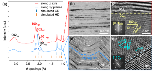6. 在20 GPa-1200 ℃条件下,分别沿z轴和xy平面热压缩石墨实现向六方金刚石(HD)和立方金刚石(CD)的相变研究。