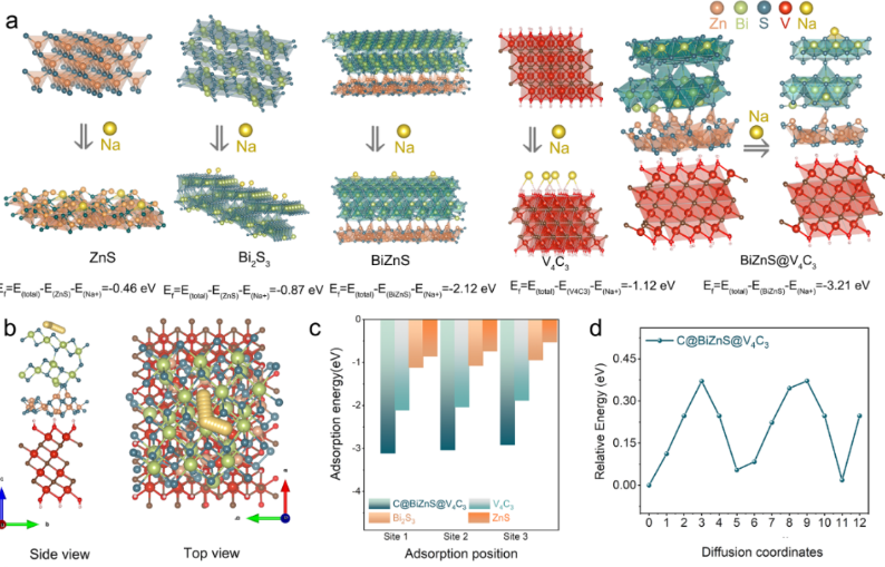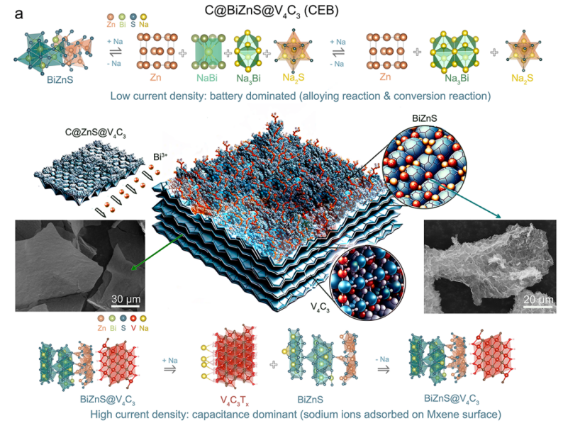 图1. C@BiZnS@V₄C₃(CEB)异质结构及双机制储能示意