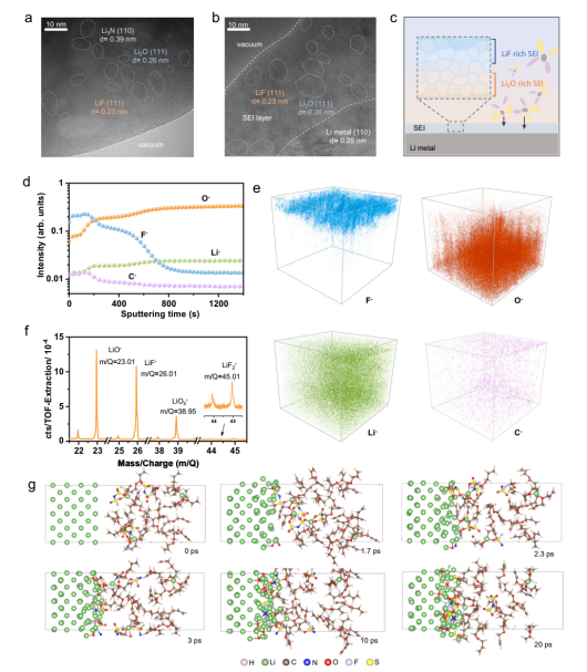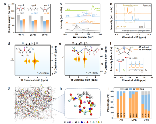 研究团队以1,2-二甲氧基乙烷(DME)、二丙醚(DPE)为参照,构建了具有“准弱溶剂化”结构的烯丙基醚(AE)电解质。该设计依托于AE端基的C=C的π电子与Li+形成的准三齿弱配位模式,不仅显著降低了脱溶剂化能垒,还通过NGP效应引导FSI-阴离子在锂金属表面优先吸附和分解,形成具有双层构型的SEI:外层为电子绝缘的LiF-rich层,内层为离子导电的Li2O-rich层,兼具抑制副反应和促进Li+传输的双重功能。同时通过拉曼、2D NMR、XPS、cryo-TEM、TOF-SIMS等多种手段,结合分子动力学(MD)和从头算分子动力学(AIMD)模拟,全面揭示了NGP效应在调控溶剂化结构和促进SEI形成中的作用机制。