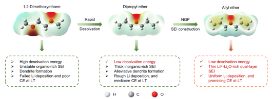 金属锂负极因其高的理论比容量(3860 mAh g-1)与低的负电位(-3.04 V vs. SHE),被视为突破现有锂离子电池能量密度瓶颈的最佳选择。然而,其实际应用仍面临诸多挑战:锂枝晶的不可控生长、剧烈的界面副反应,以及在低温条件下因脱溶剂化能垒升高而导致的离子传输动力学迟滞。这些问题严重制约了锂金属电池的循环寿命。当前,改善低温性能的策略主要包括引入低熔点溶剂、含氟溶剂或添加剂,但这些方法往往伴随成本高昂、环境兼容性差、以及所形成SEI(固体电解质界面)机械性能不佳等问题。