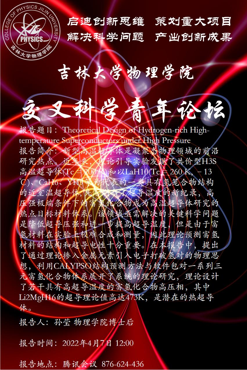 报告题目: Theoretical Design of Hydrogen-rich High-temperature Superconductors under High Pressure