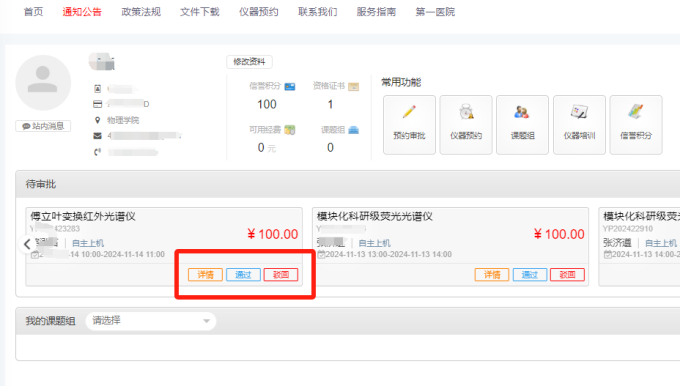 7. 仪器管理员登陆系统,在系统首页可看到相应的预约情况,经过管理员审批同意后,则顺利完成仪器预约。
