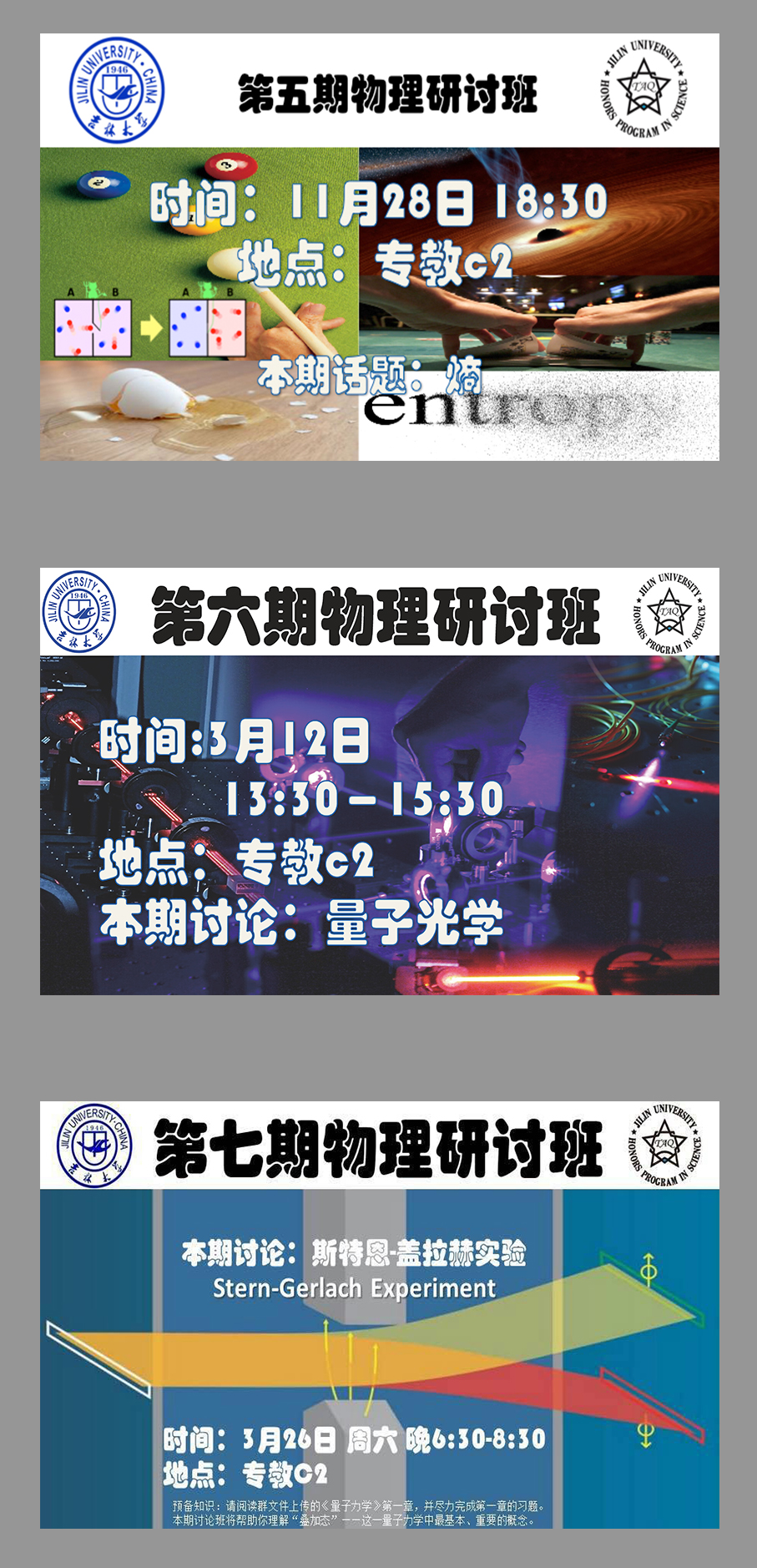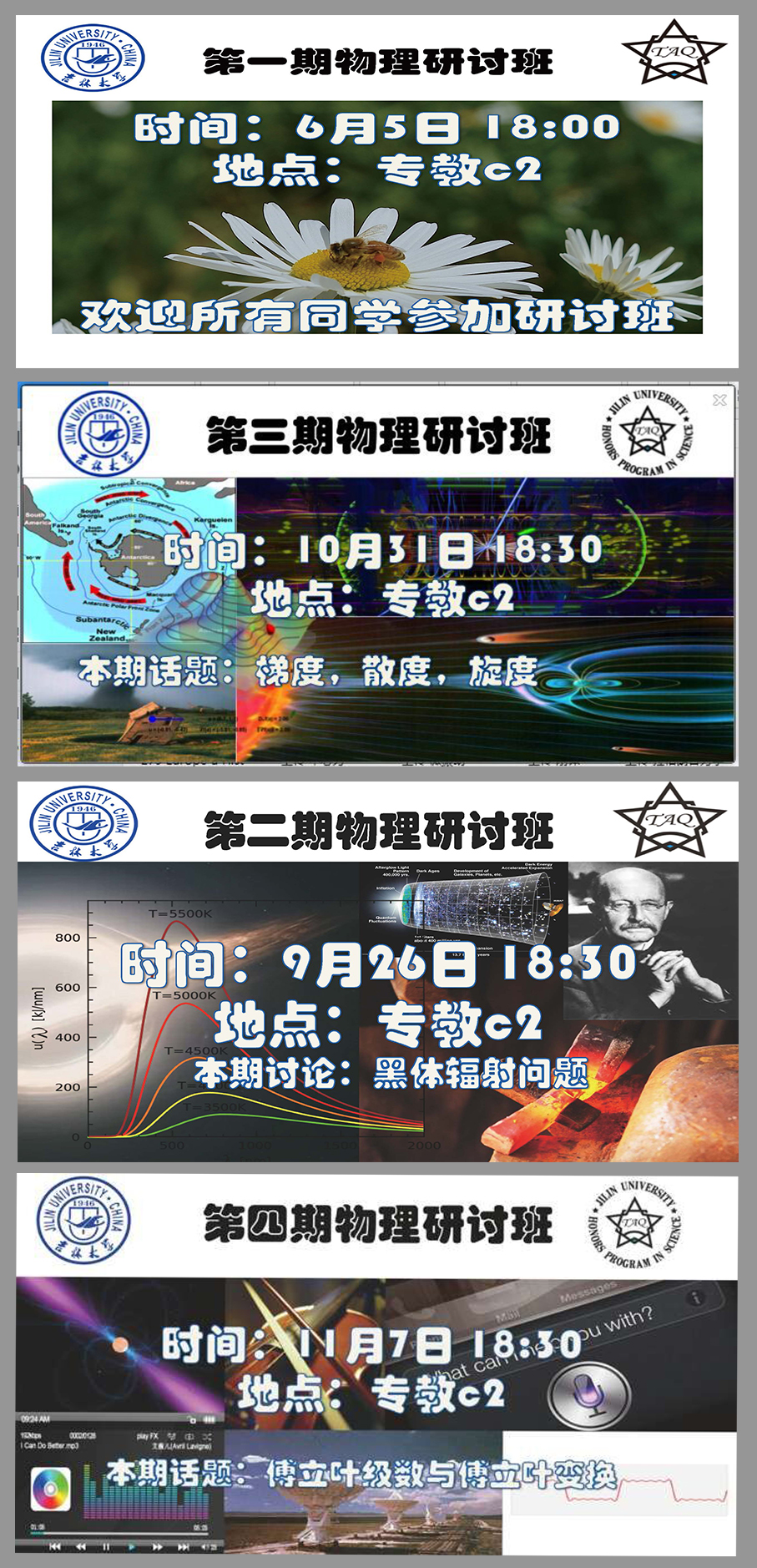 物理研讨班”目前已举办了七期,内容涉及“玻色爱因斯坦凝聚”,“黑体辐射”,“梯度,旋度,散度”,“傅立叶级数与傅立叶变换”,“熵”,“量子光学(光与原子相互作用)”,“斯特恩-盖拉赫实验”等等,每期活动时长约为2个小时,得到了PA捕鱼网官网入口相关教师的大力支持。