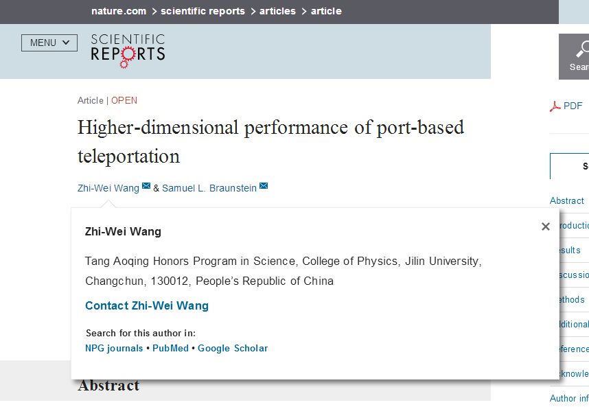9月8日,PA捕鱼2016届唐敖庆班学生--王志伟同学在Nature 旗下的“Scientific Reports”杂志上以第一作者兼通讯作者身份发表了题为《基于端口的量子隐形传态的高维表现》(Higher-dimensional Performance of Port-based Teleportation)的研究论文。论文由王志伟同学在本科毕业前夕完成并投稿,历经3个多月的等待,论文于昨日正式发表。