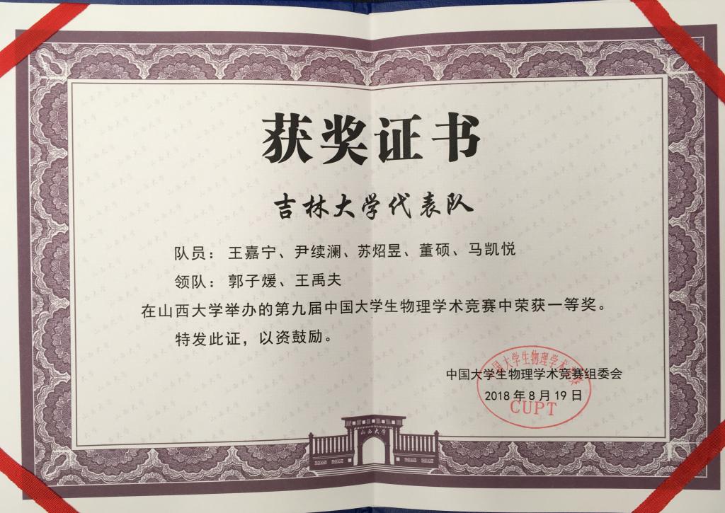2018年8月19日,第九届中国大学生物理学术竞赛(CUPT)在山西大学圆满落幕,PA捕鱼网官网入口代表队取得历史性突破,获得一等奖。