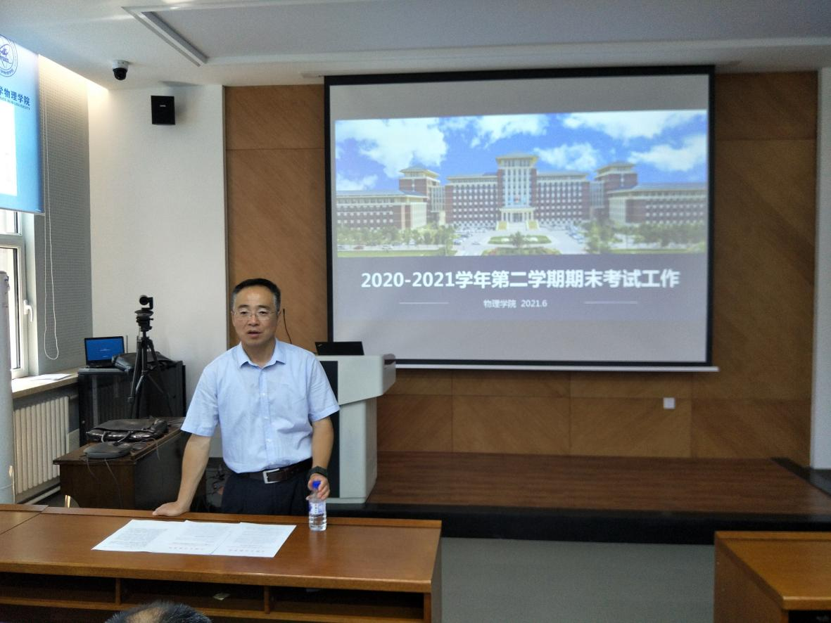 2021年6月24日上午,PA捕鱼网官网入口在物理楼333召开了2020-2021学年第二学期期末考试考务工作会,会议由教学副院长王海军主持,校教学督导专家崔志文教授、全体命题老师、部分监考老师及教学秘书参加了本次会议。
