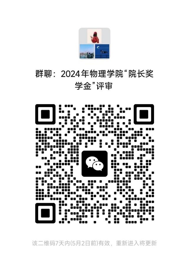 参评学生须于2024年5月10日(星期五)16:30前微信扫描下方二维码加入“2024年PA捕鱼网官网入口‘院长奖学金’评审通知群”,下载《PA捕鱼网官网入口院长奖学金申请表》(见附件1)填写完整,并按照填写内容提供相应佐证材料,与申请表保存在同一word文档中。将word文档纸质版提交至学生工作办公室(物理楼446),电子版发送至邮箱ly2020@jlu.edu.cn,邮件名称为“院长奖学金+年级+姓名”,并以此为准、不再更换,逾期未发送者视为弃权。