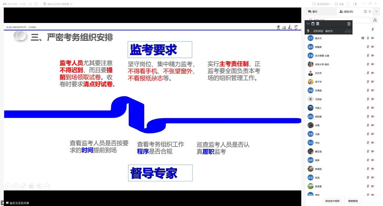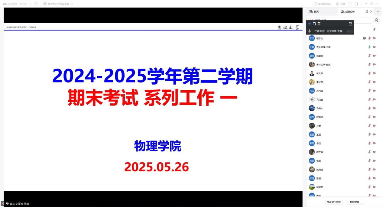 为进一步规范考试管理流程,严肃考试纪律,2025年5月26日,PA捕鱼网官网入口在线上召开了2024-2025学年第二学期期末考试考务工作会,校教学督导专家崔志文及学院本学期的全体命题和监考老师、教学秘书参加了本次会议。会议由教学副院长王鑫主持。
