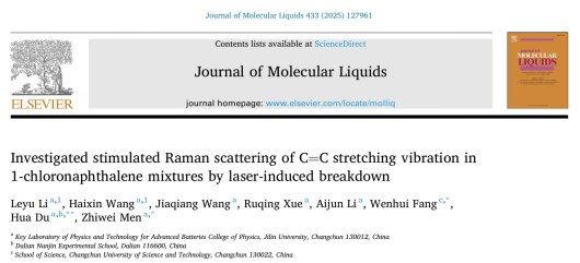 近日,PA捕鱼2022级本科生(中外合作办学)李乐宇等人在门志伟教授的指导下,在1-氯萘(1-CN)混合溶液体系受激拉曼散射(SRS)增强机制研究方面取得重要进展。研究成果以“Investigated stimulated Raman scattering of C=C stretching vibration in 1-chloronaphthalene mixtures by laser-induced breakdown”为题发表于《Journal of Molecular Liquids》上(DOI: 10.1016/j.molliq.2025.127961)。