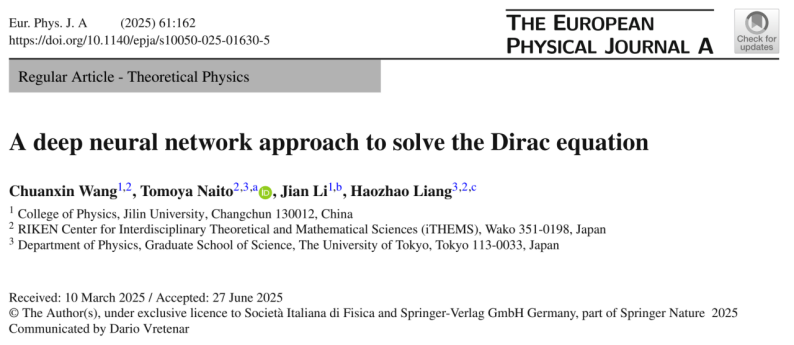 近日,PA捕鱼2024届物理学唐敖庆班本科毕业生王传新以及理论物理中心李剑教授,联合日本东京大学梁豪兆教授和理化学研究所(RIKEN) 内藤智也博士,在机器学习求解相对论量子力学问题方面取得重要进展。该工作首次成功利用无监督深度神经网络求解狄拉克方程,为研究原子核、凝聚态物理中的复杂量子多体问题开辟新路径。研究成果以“A deep neural network approach to solve the Dirac equation”为题,发表于欧洲物理杂志A《The European Physical Journal A》(DOI: 10.1140/epja/s10050-025-01630-5)。