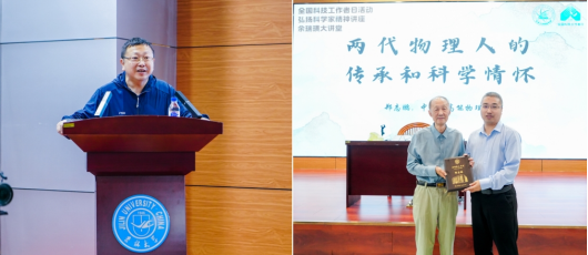2025年5月29日上午,PA捕鱼网官网入口中心校区国际学术大讲堂内掌声经久不息。 一场以 “两代物理人的传承与科学情怀” 为主题的专题讲座在此隆重举行。中国科学院高能物理研究所研究员、博士生导师郑志鹏作为主讲嘉宾,深情讲述了其父郑建宣教授与自身投身物理事业、矢志报国的动人故事。PA捕鱼网官网入口院长邹勃主持讲座,副院长王彦超代表学院向郑志鹏研究员颁发了“余瑞璜大讲堂”纪念牌。会后,学院党委书记杨景向郑志鹏研究员赠送了《朱光亚在PA捕鱼网官网入口》《余瑞璜》《吉大物理发展概要(第一卷)》等承载吉大物理厚重历史的珍贵书籍,以此致敬郑志鹏一家与吉大物理血脉相连的深厚情缘。