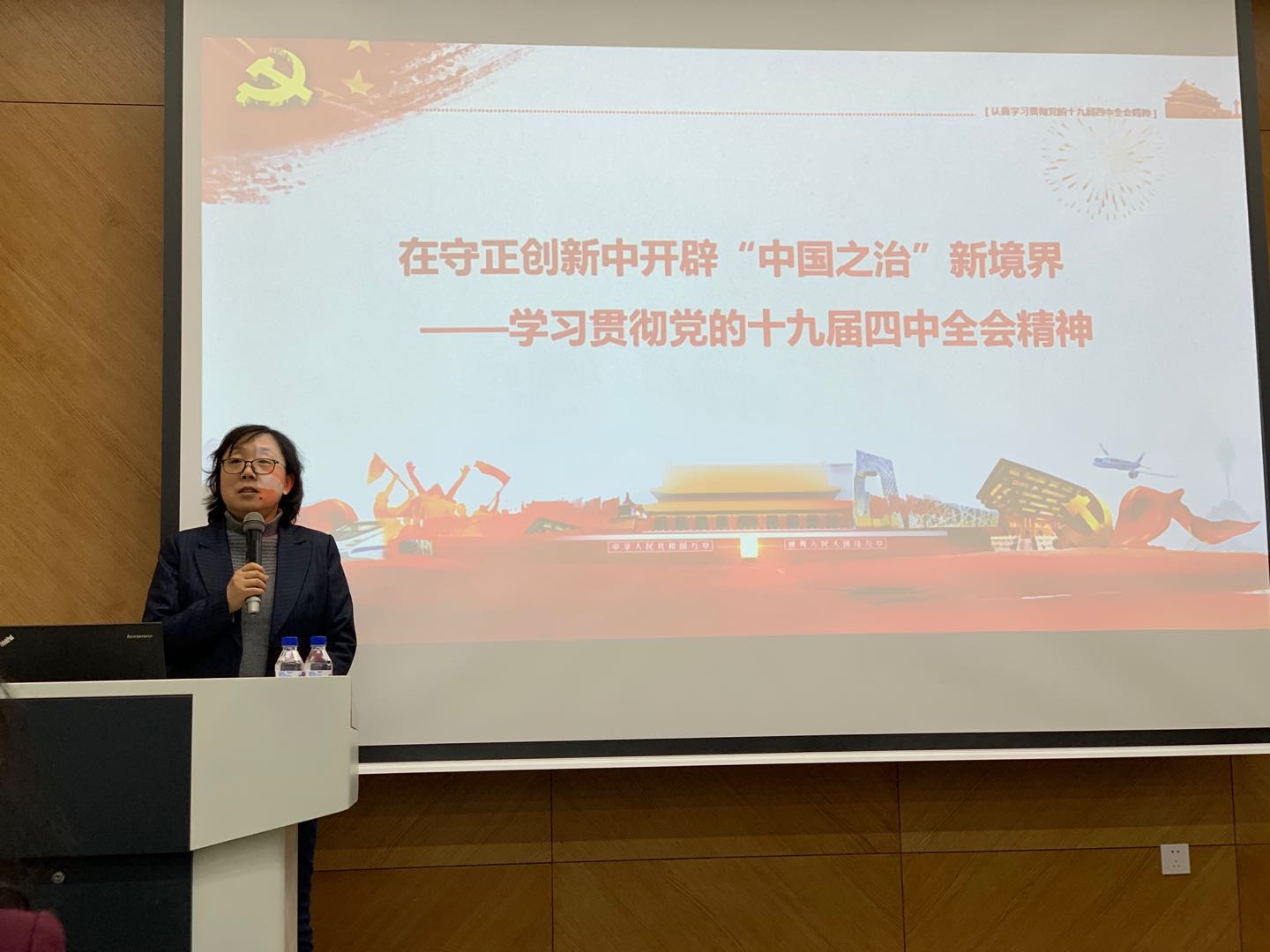 2019年12月11日下午,马克思主义学院副院长石瑛教授在物理楼333报告厅为PA捕鱼网官网入口班子成员、党委委员、纪委委员、全体教工党员、学生党支部支委和学生党员代表作“在守正创新中开辟‘中国之治’新境界——学习贯彻党的十九届四中全会精神”专题辅导报告,报告会由学院党委书记孟文卓主持。