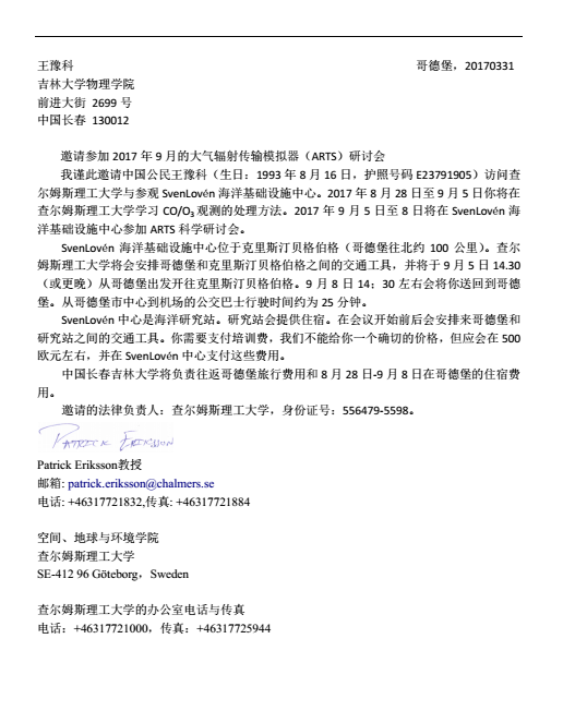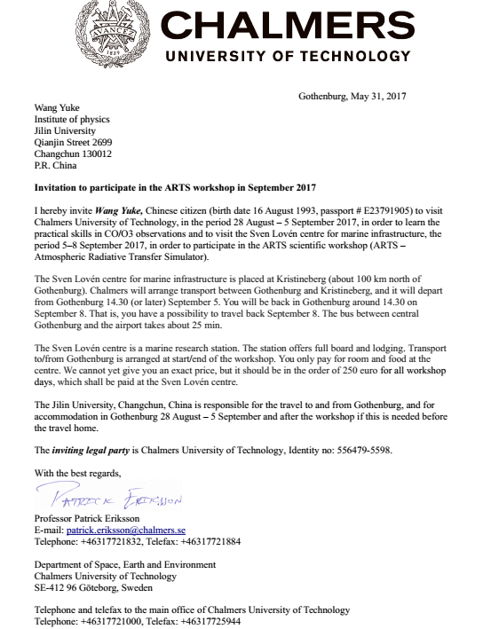 出访瑞典查尔姆斯理工大学进行培训,并参加大气辐射传输模拟器(ARTS)研讨会。