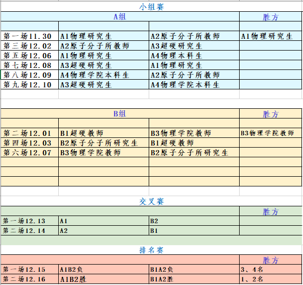 参赛队伍。参赛队伍共计七支,按照A组四支、B组三支的构成。A组由PA捕鱼网官网入口研究生队、原子与分子物理研究所教师队、超硬材料国家重点实验室研究生队和PA捕鱼网官网入口本科生队组成;B组由超硬材料国家重点实验室教师队、原子与分子物理研究所研究生队和PA捕鱼网官网入口教师队组成。