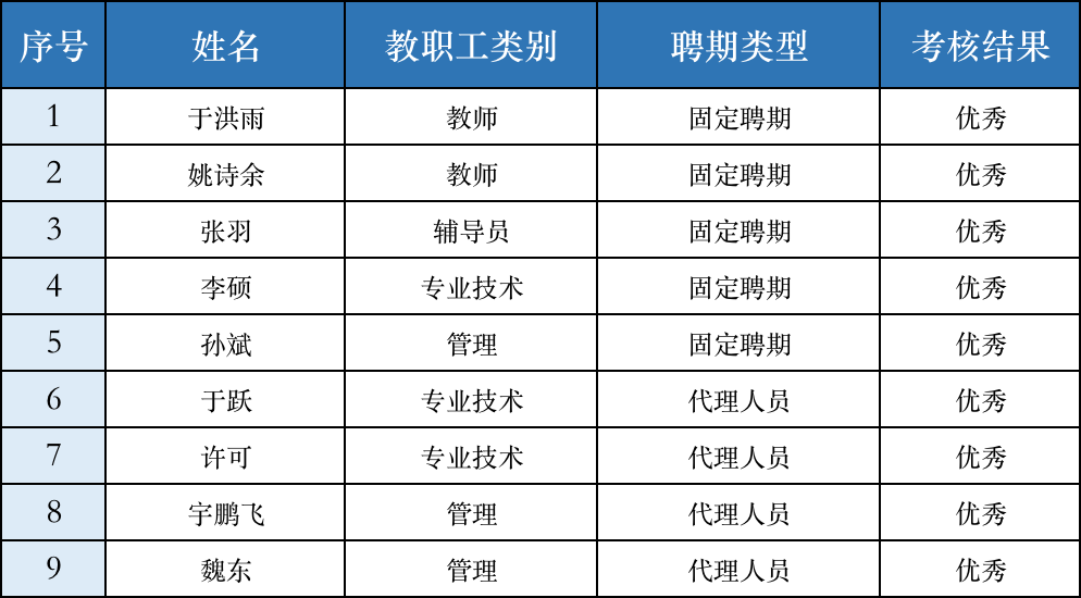 根据PA捕鱼网官网入口人力资源处《关于做好学校新聘教职工固定聘期考核工作的通知》(校人字〔2022〕83 号)、《PA捕鱼网官网入口教职工聘期考核工作过渡方案》等文件精神,PA捕鱼网官网入口结合实际,制订《PA捕鱼网官网入口新聘教职工固定聘期考核工作实施细则》,于2022年7月18日组织考核工作小组对固定聘期及代理人员进行了考核,并将考核结果提请PA捕鱼网官网入口党委会、PA捕鱼网官网入口党政联席会进行审议。经学院党委会、党政联席会讨论通过,确定考核结果如下: