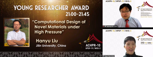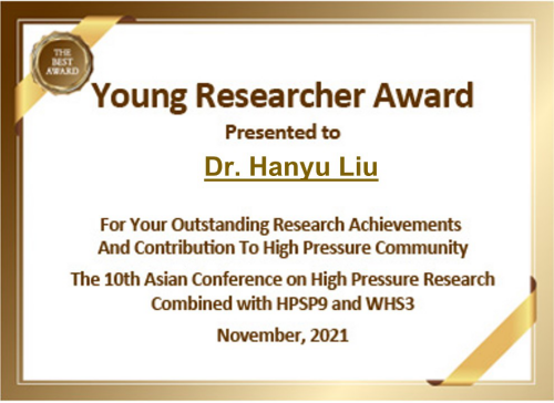 2021年11月22日,亚洲高压物理协会将第十届亚洲高压会青年科学奖(Young Researcher Award)授予PA捕鱼网官网入口计算方法与软件国际中心刘寒雨教授,以表彰其在高压科学领域的杰出成就和突出贡献。“亚洲高压会青年奖”每两年评选一次,刘寒雨教授是2021年度该奖项两位获奖人之一。