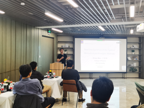 门志伟在报告中介绍了他们实验组开发出的一种“超声锤”技术,该项技术能在一秒钟内重复冲击样品几万到几十万次,并且冲击能量相同,有着可控冲击次数、重复性好的独特优势,可以有效控制含能材料“热点”形成位置和生长速率,从而更精准控制炸药等含能材料的起爆时刻和爆轰温度。报告结束后,参会人员进行了进一步深入交流和讨论,高度肯定了“超声锤”技术巨大的应用价值,双方表示,会定期举办此类活动,进一步推进产学研深层次合作。