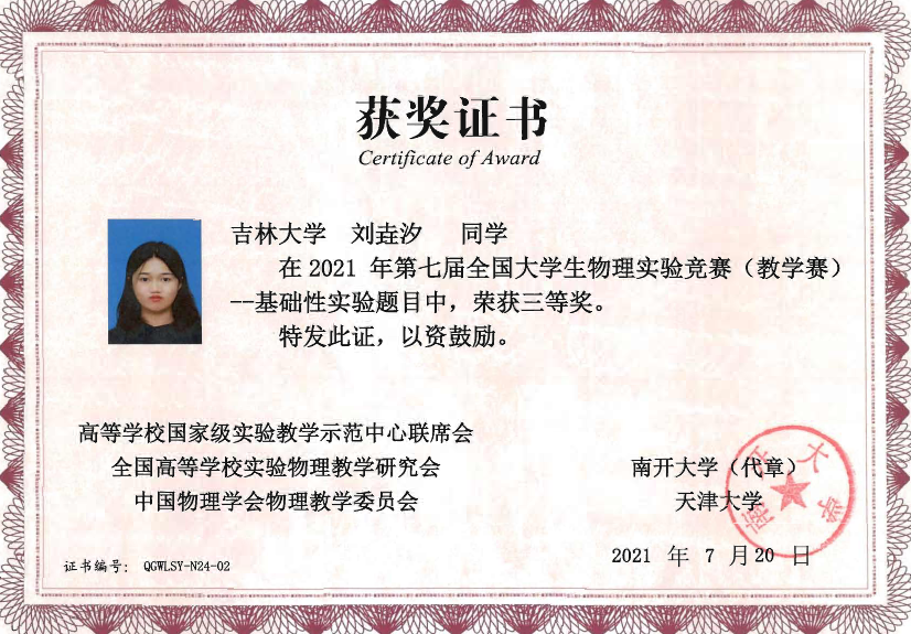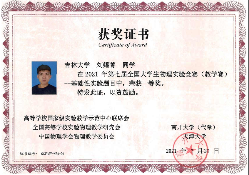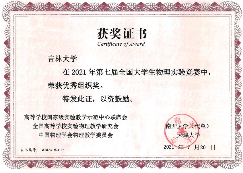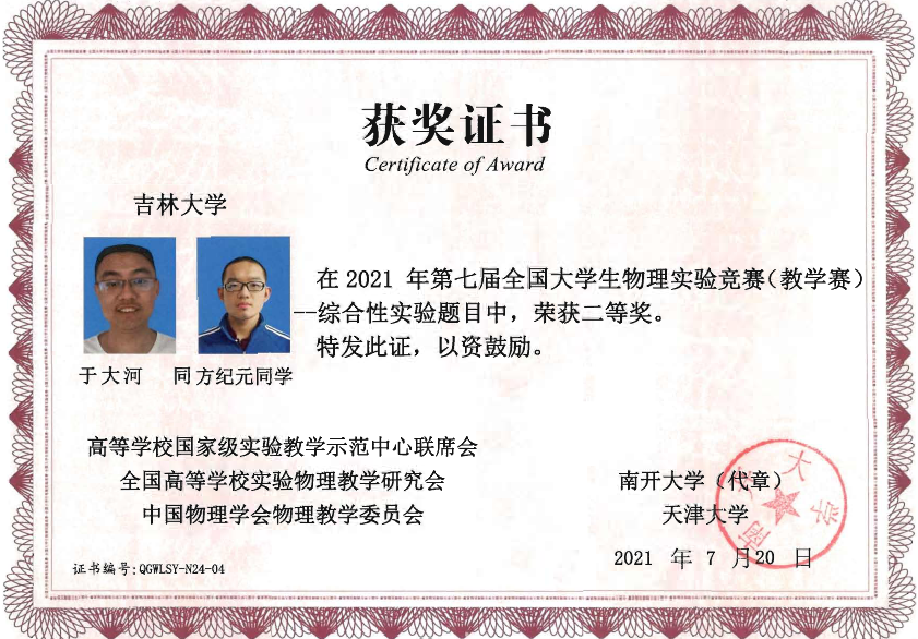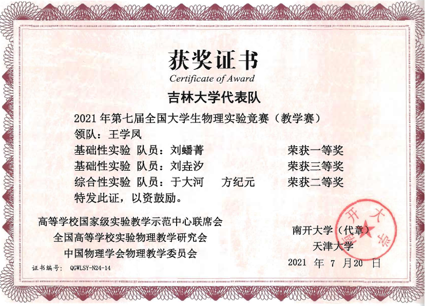 2021年7月18日至21日,第七届全国大学生物理实验竞赛(教学赛)在天津举行,共有来自全国112所高校的380名本科生参赛。其中,PA捕鱼网官网入口代表队由PA捕鱼网官网入口的4名本科生组成,他们在比赛中取得了佳绩:2019级本科生刘蟠菁获基础性实验一等奖,2019级本科生于大河、方纪元获综合性实验二等奖,2018级本科生刘垚汐获基础性实验三等奖,我校荣获竞赛优秀组织单位。