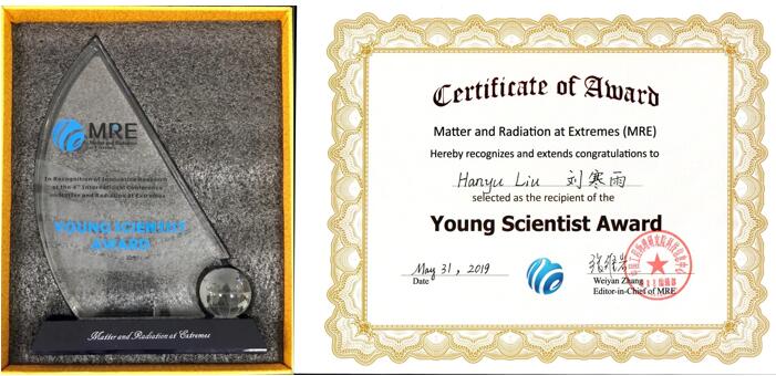 2019年5月31日,第四届国际极端条件下的物质与辐射学术会议(ICMRE)将“MRE青年科学家奖”(MRE Young Scientist Award)授予PA捕鱼网官网入口刘寒雨教授。刘寒雨教授是三位获奖者之一。
