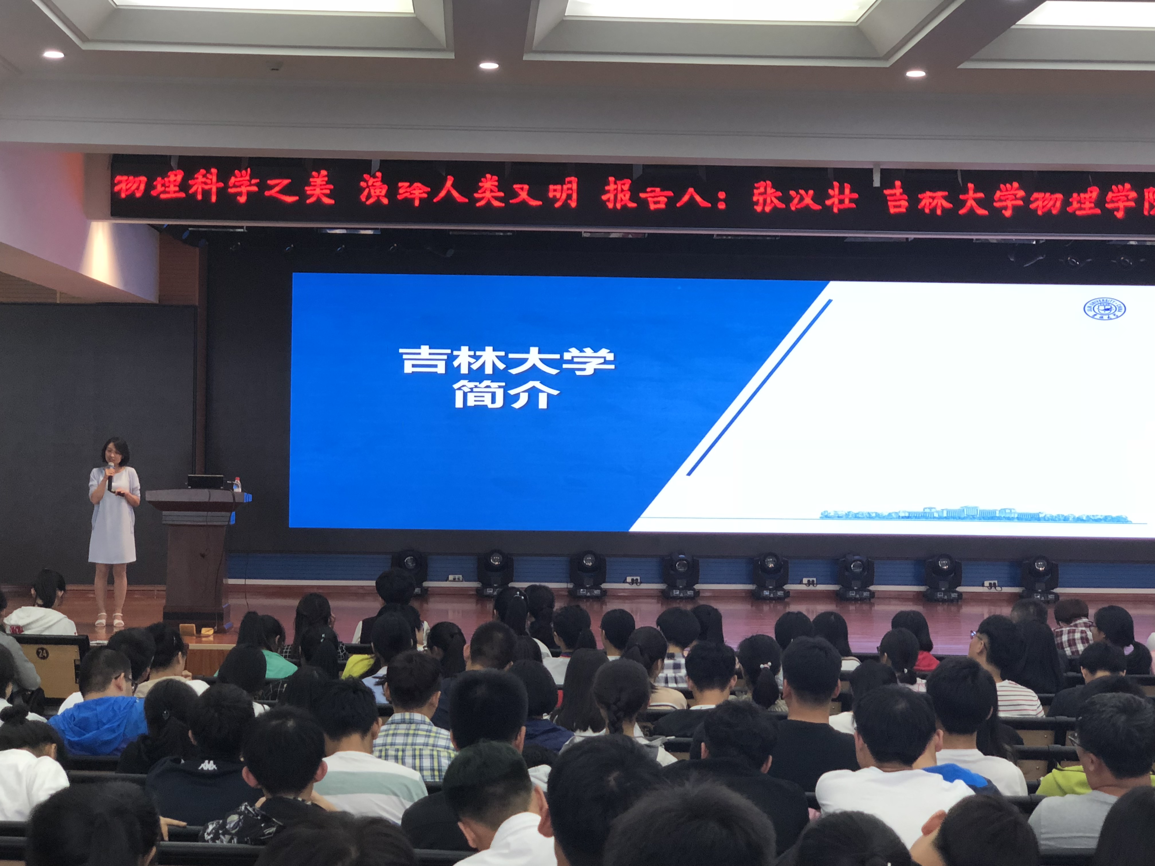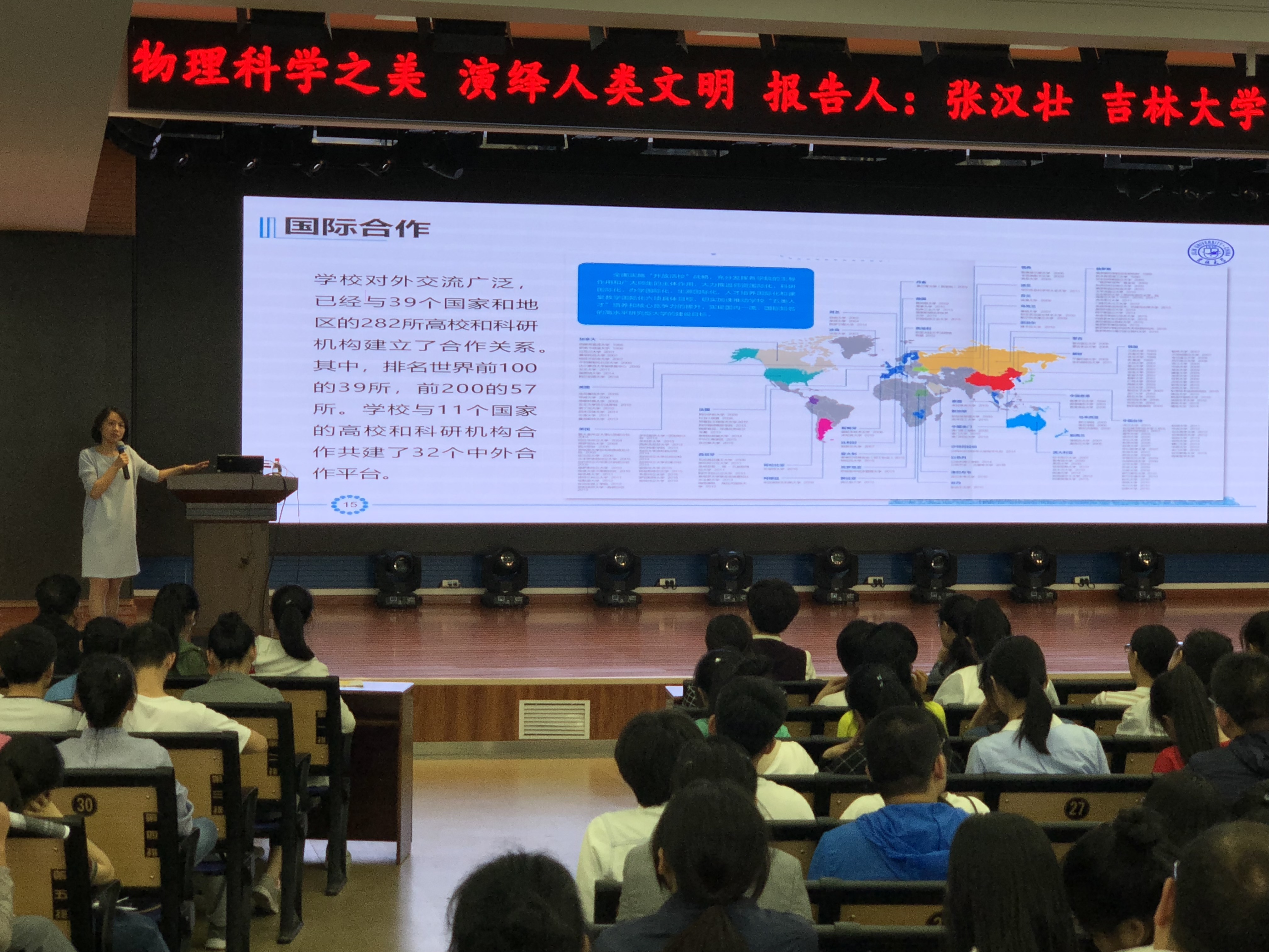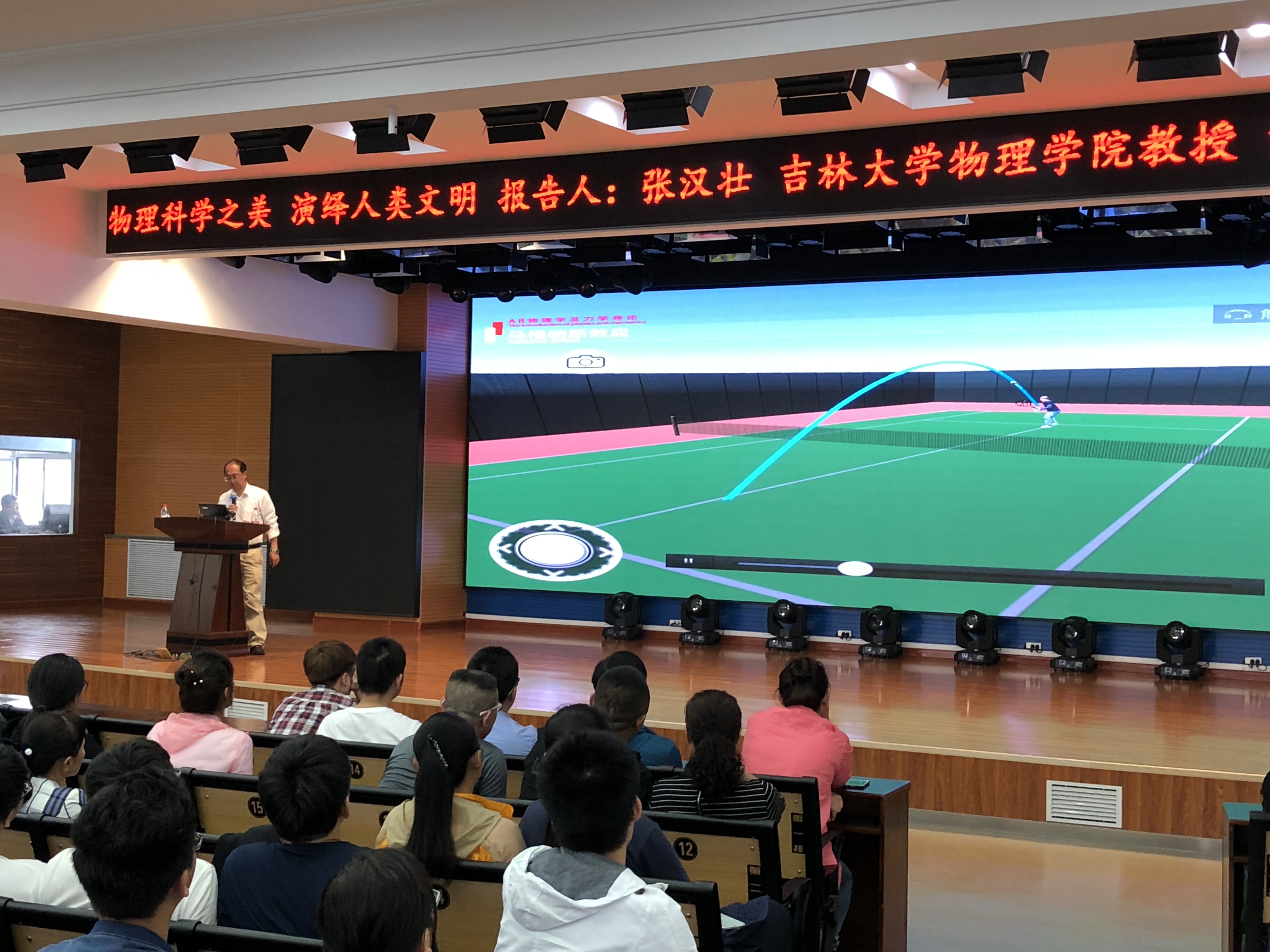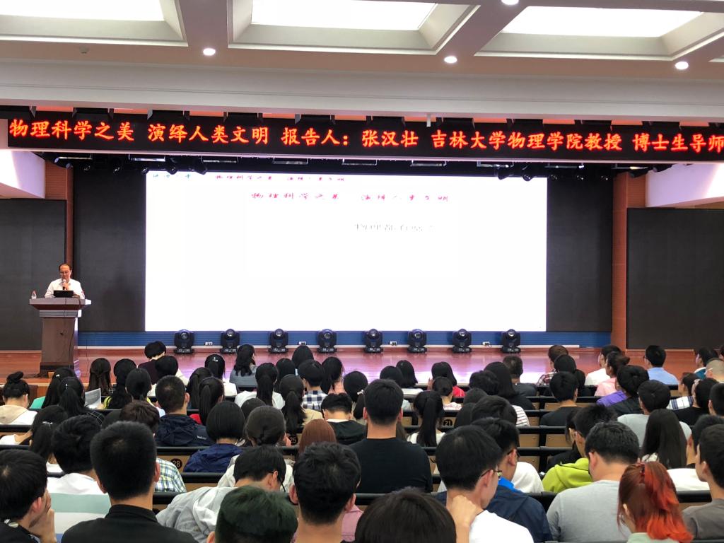 宣讲会第一项由张汉壮教授为到场的学生及家长做了题为“物理科学之美,演绎人类文明”的报告。张汉壮教授将物理学基本知识领域以“山”、“饼图”等形式化繁为简进行了全方位展示,他以“无形的力量之手”、“世界冷暖的奥秘”等形象趣味的标题为线索回顾了物理的发展历程,阐述了“见物讲理,以理造物”的物理逻辑。“很多学生觉得学物理没用,挣不了大钱,所以对物理兴趣索然”,张教授指出,如今便利舒适的生活条件与物理学的重大突破具有紧密的联系,“物理能让我们了解自然宇宙,指导和引领科学技术活动,培养逻辑思维和探索创新精神”。张汉壮教授还在报告中加入了动画、视频、AR演示等技术手段,将物理知识生动的演示出来,让在场的教师、学生及家长发出一次次热烈的掌声。最后,张汉壮教授对刚刚高考结束的学生表达了最衷心祝福,希望每位同学都可以取得理想的成绩,考入自己心仪的大学。