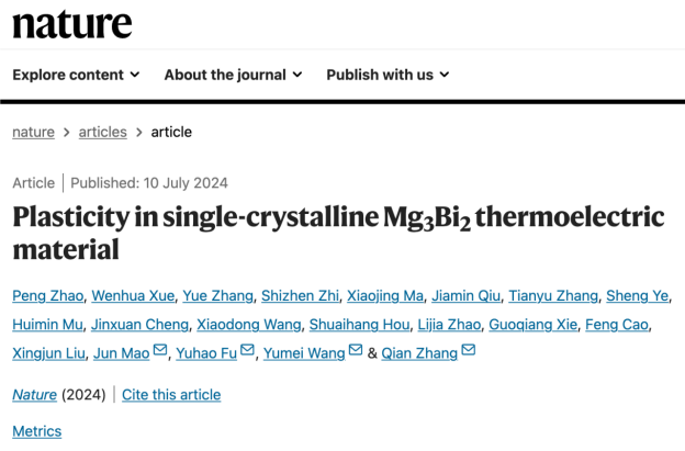 近日,PA捕鱼网官网入口材料学院张立军教授团队(半导体光电材料智能设计与制备课题组)、PA捕鱼网官网入口物质模拟方法与软件教育部重点实验室付钰豪副教授与哈尔滨工业大学深圳校区毛俊教授和张倩教授、中国科学院物理研究所王玉梅副研究员等人合作,在塑性半导体功能材料方面取得了重大突破,首次发现层状结构的Mg3Bi2单晶室温下兼具有优异塑性和高热电性能,面内拉伸应变接近100%、热电优值zT~0.65,理论与实验结合,揭示了塑性变形的微观机制。这一重大研究成果以“Plasticity in single-crystalline Mg3Bi2 thermoelectric material”为题,于2024年7月10日发表在Nature上。
