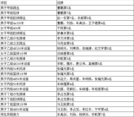 5月15-16日,PA捕鱼网官网入口第六十三届田径运动会在中心校区体育场举行。PA捕鱼网官网入口44名教职工参加本次运动会,报名参与了30个竞赛项目,团体总分排全校第七名,前六名分别为白求恩第三临床医学院、白求恩第二临床医学院、白求恩第一临床医学院、附属学校代表队、校部机关代表队、基础医学院代表队。