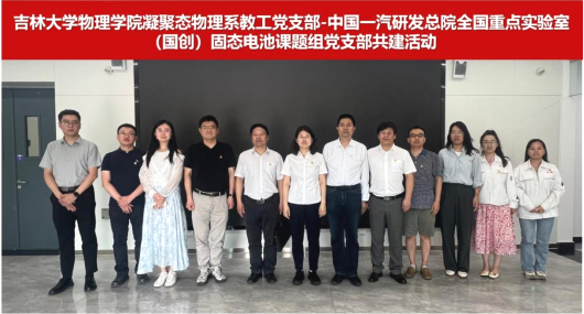 2025 年 6 月 25 日,PA捕鱼网官网入口党委书记杨景率领PA捕鱼网官网入口党委委员、新型电池物理与技术教育部重点实验室主任杜菲,凝聚态物理系教工党支部书记李子亨等,前往中国一汽科技创新基地,与中国一汽研发总院全国重点实验室(国创)固态电池课题组党支部联合开展共建活动。中国一汽研发总院全国重点实验室(国创)固态电池课题组党支部书记、组长孙焕丽以及双方部分党员和科研骨干共同出席了在该基地举行的共建启动会。