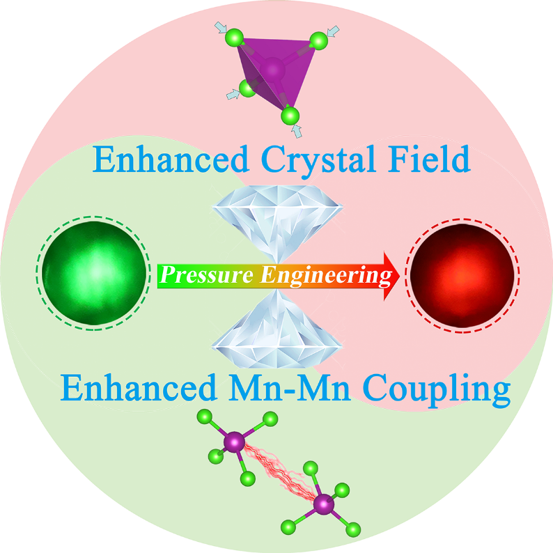 白光发射二极管 WLED) 因其多场景应用而成为重要的新一代固态光源之一。然而,由于缺乏具有高显色指数 (CRI) 的红光发射组分,WLED 通常会发出刺眼的白光。开发一种在蓝光区域具有强吸收能力并在红光区域有效发射的红光发光材料是一项挑战。压强可以通过改变材料的晶体结构和电子构型,进而有效调控材料的物理和化学性质。尽管一些基相关的金属卤化物在高压下实现红色发射的研究已有报道,但是其红色发射在压力完全释放后消失,这在很大程度上抑制了这种材料的实际应用。因此,探索经压力处理后仍能保持高效红光发射性能的锰基金属卤化物具有重要的研究意义与应用价值。