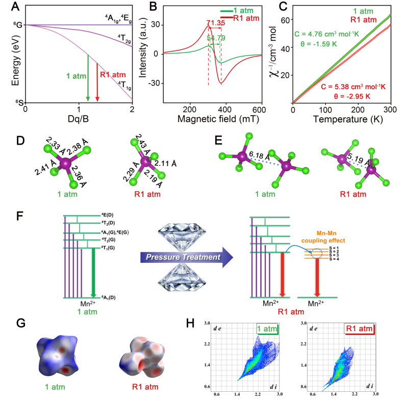 4. 压力处理前后(C6H14N2)MnCl4的Tanabe-Sugan (T-S) 图、电子顺磁共振谱、磁化率测量谱、分子动力学模拟的局域结构、Hirshfeld表面分析和2D指纹图,以及压力工程处理后(C6H14N2)MnCl4中红光截获的机理示意图。